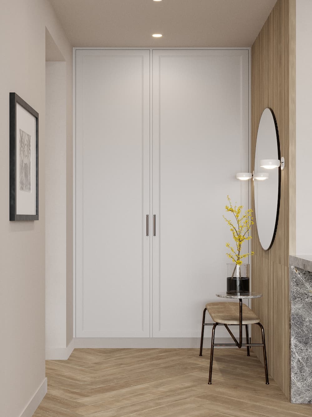 Az előtér egy -általában- kisebb, de annál fontosabb része egy ingatlannak. Megérkezéskor ez a helyiség fogad minket, távozáskor pedig innen lépünk ki a nagy világba. Fontos, hogy ezek a tevékenységek minél könnyebbek és komfortosabbak legyenek. A beépített szekrény elnyeli az összes előtérben tárolt holmit, a tükör alatt lévő pad pedig akár a lepakolásban, akár a cipőfelvételben jó barátunk lehet.