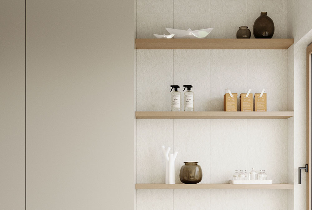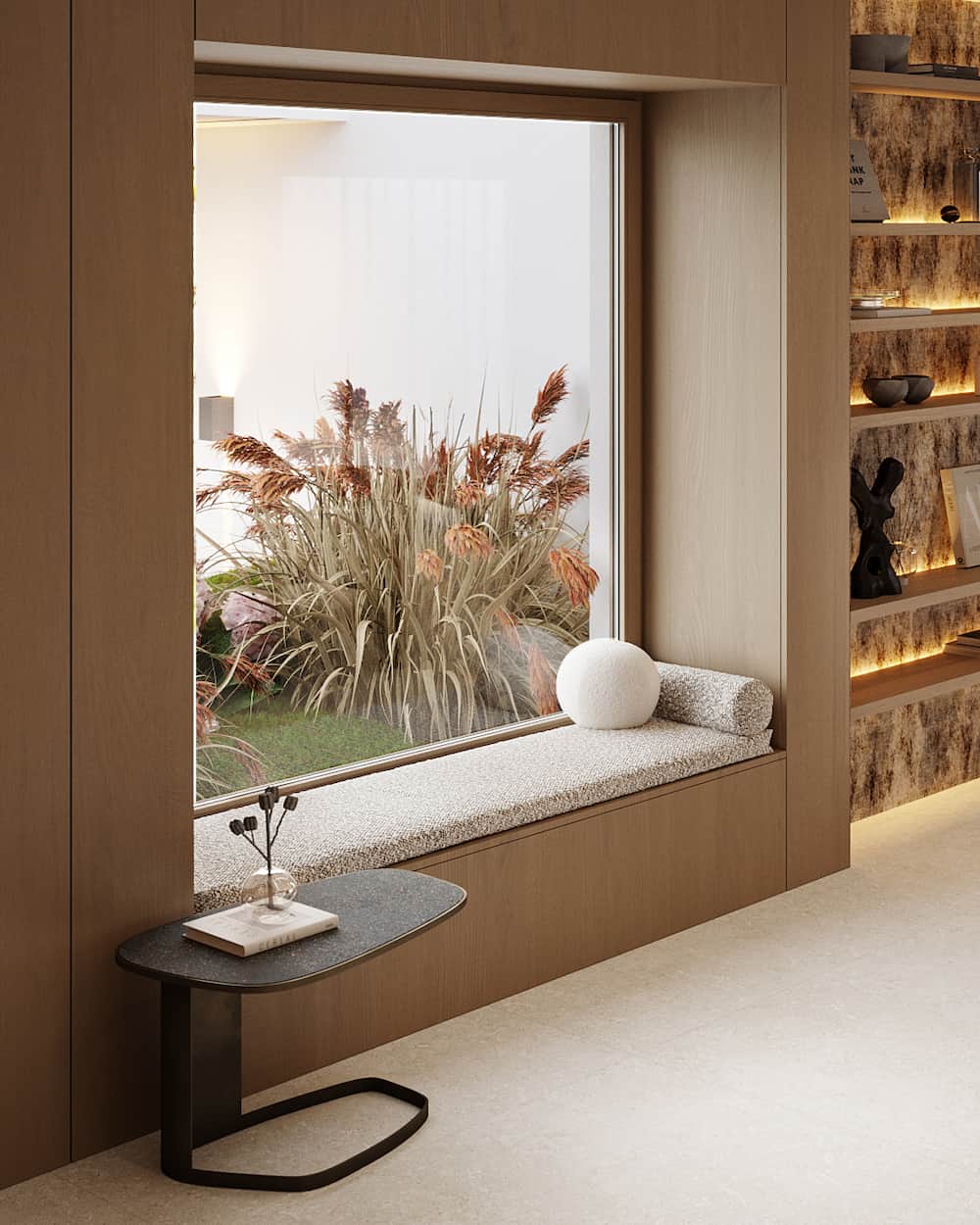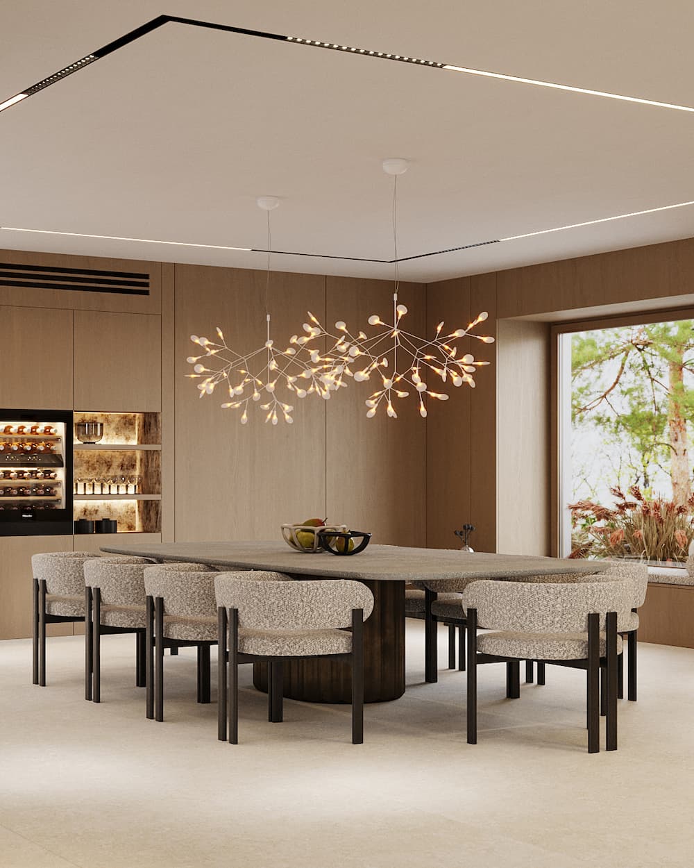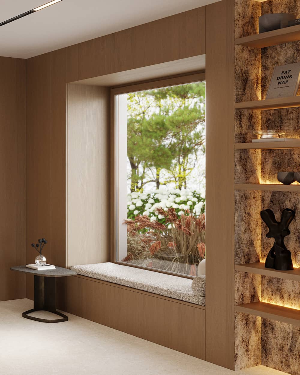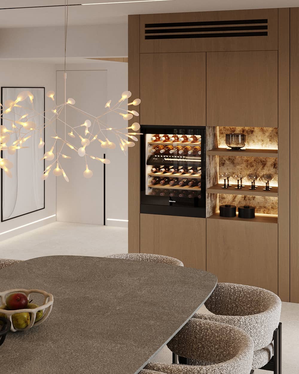 Ügyfeleim sokszor fogadnak vendégeket, nagyobb társaságot, családot, így fontos szempont volt hogy ennek helyet biztosítsunk az étkező térben. Helyet kapott egy borhűtő is, mellette egy polcos résszel, amelyet -akárcsak a többi polcos részt- Vetrite üveggel béleltünk. A konyhától egy áthidalóhoz csatlakozó lamellás megoldással választottuk el ezt a teret, az étkezőasztal túloldalán pedig egy ablakba beülős részt terveztünk, amely szintén nagy vágya volt Ügyfeleimnek.