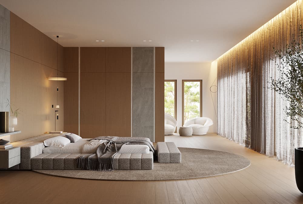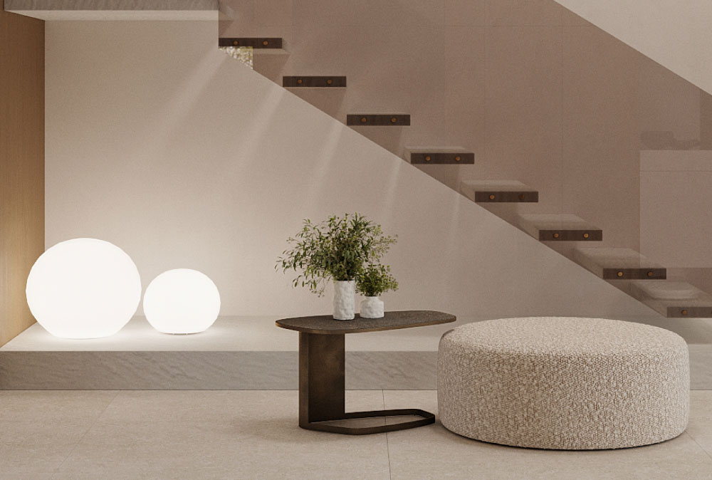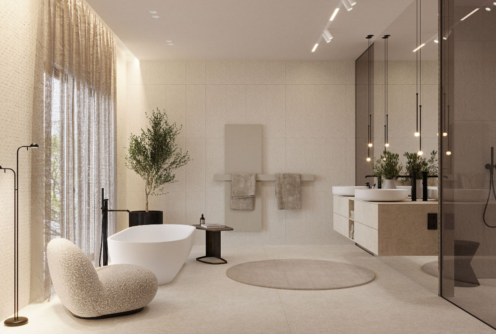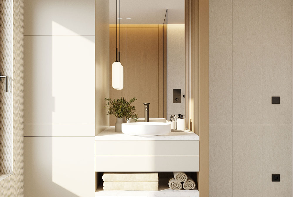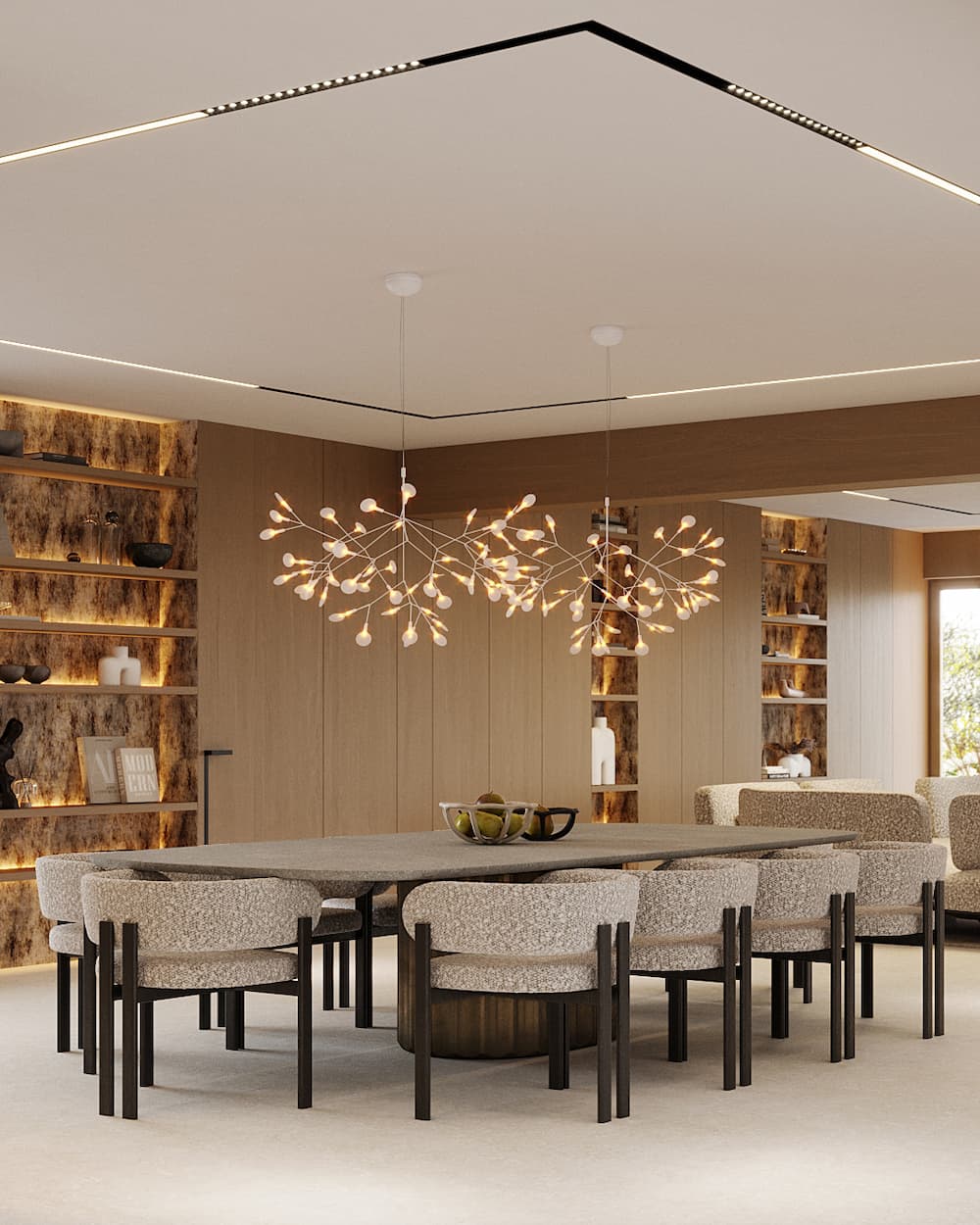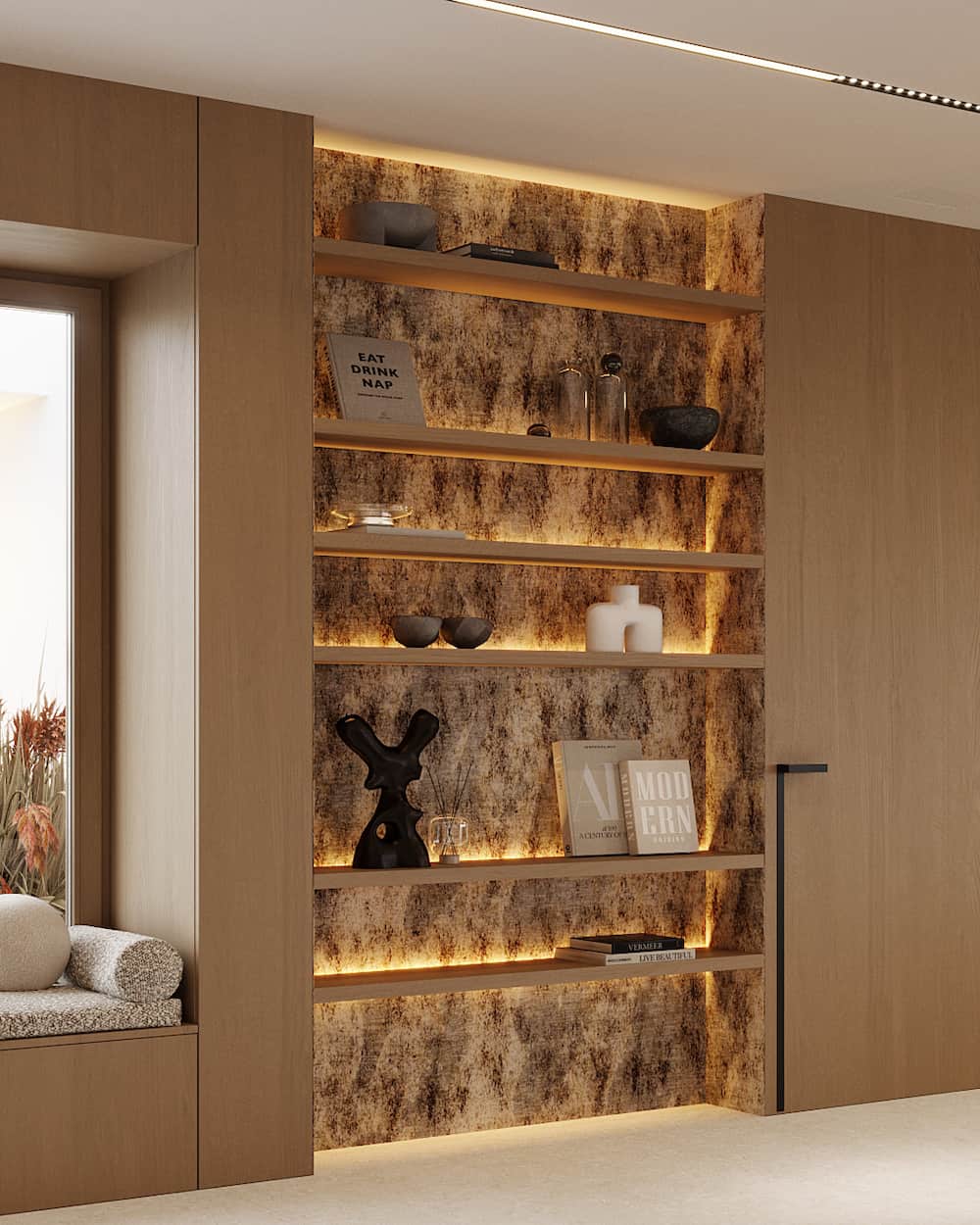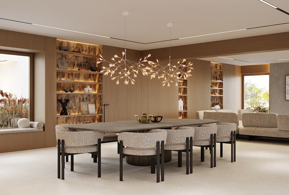 Ügyfeleim sokszor fogadnak vendégeket, nagyobb társaságot, családot, így fontos szempont volt hogy ennek helyet biztosítsunk az étkező térben. Helyet kapott egy borhűtő is, mellette egy polcos résszel, amelyet -akárcsak a többi polcos részt- Vetrite üveggel béleltünk. A konyhától egy áthidalóhoz csatlakozó lamellás megoldással választottuk el ezt a teret, az étkezőasztal túloldalán pedig egy ablakba beülős részt terveztünk, amely szintén nagy vágya volt Ügyfeleimnek.