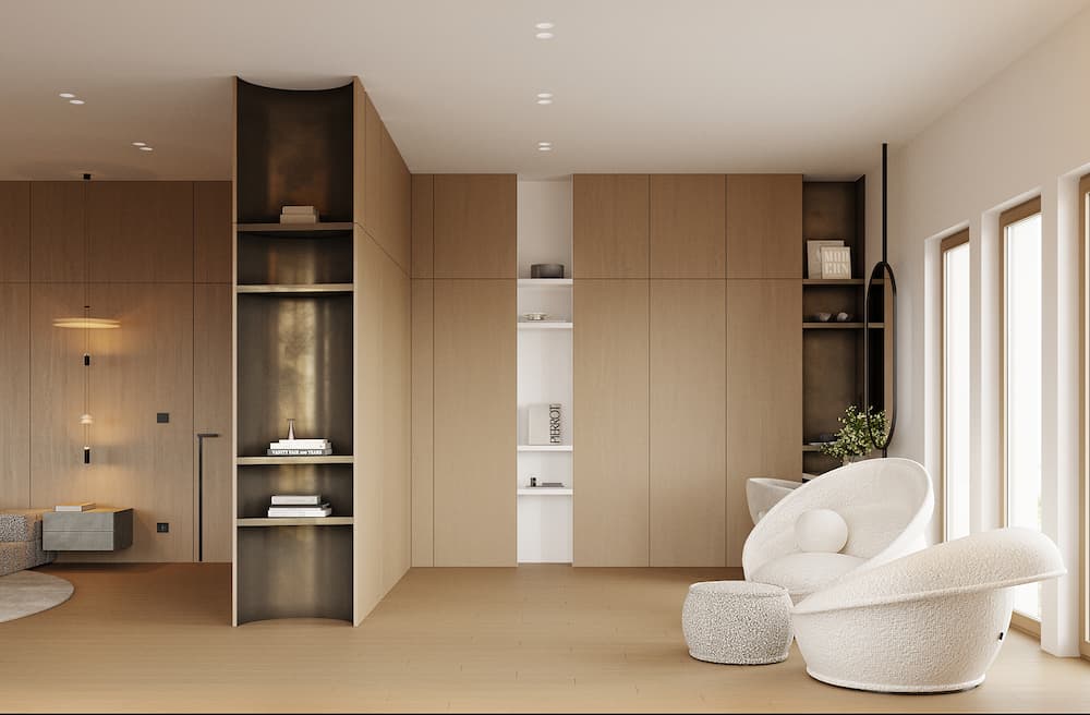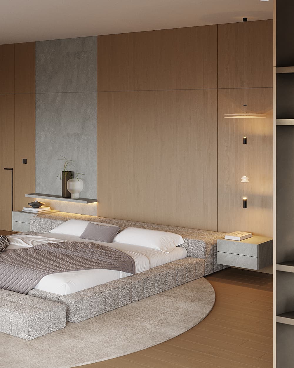 Szülői hálószoba egyik verziója. Modern, letisztult elemek, elegáns térhatás.