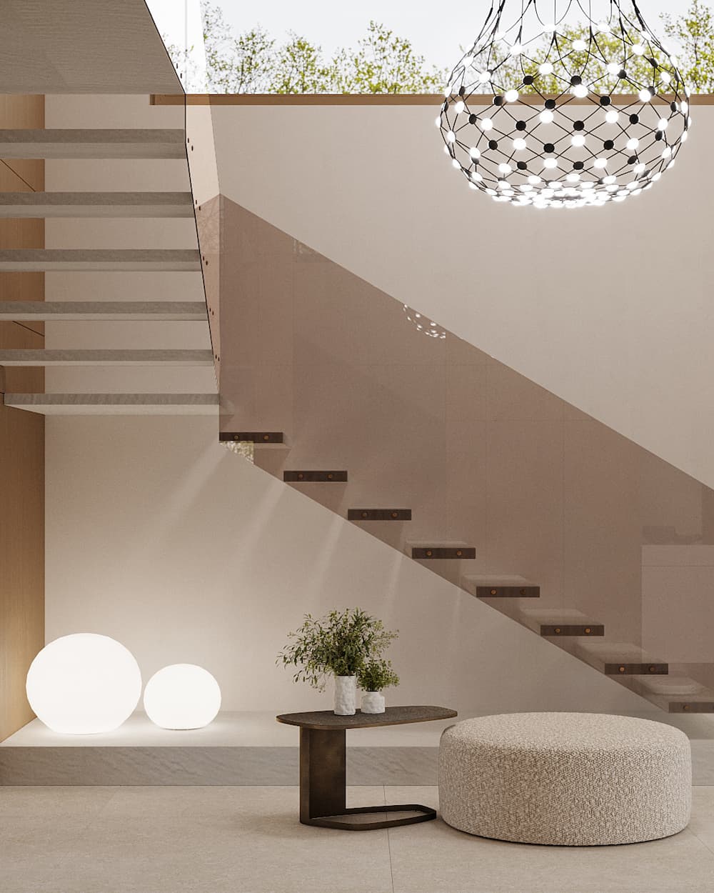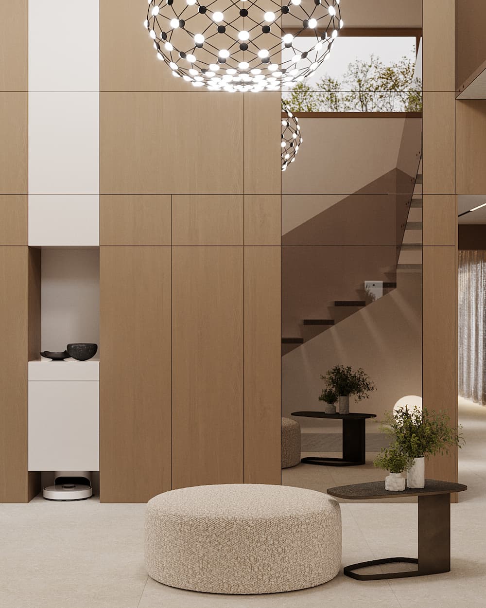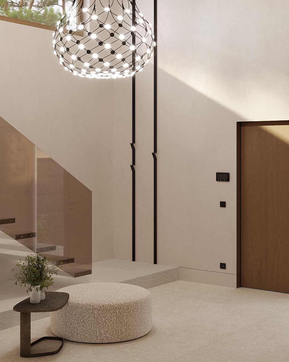 Megérkezve a házba az elegáns, nagy belmagassággal rendelkező, otthonos és meleg előtér fogad bennünket. A világítások réteges használatával és a fa burkolatokkal meleg és otthonos környezetet varázsoltunk, a teljes belmagasságú fém akasztóval pedig különleges és egyben praktikus helyet alakítottunk ki a kint maradó pár ruhadarab számára.
