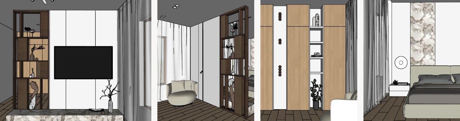 03 / Az elfogadott berendezés alapján megkezdődik a tervezés kicsit kézzel foghatóbb és számodra is látványosabb része! Modell szintű látványterveken veheted szemügyre a tervezett helyiségek, bútorok, falfelületek, burkolatok stb. összehangját. Ezeken a terveken átbeszéljük a kialakult koncepciót és az esetleges módosítások, kiegészítések után elkészül a végleges modell szintű terv. Ezt elküldöm Neked egy utolsó, a fotorealisztikus látványtervezés megkezdése előtti jóváhagyásra.