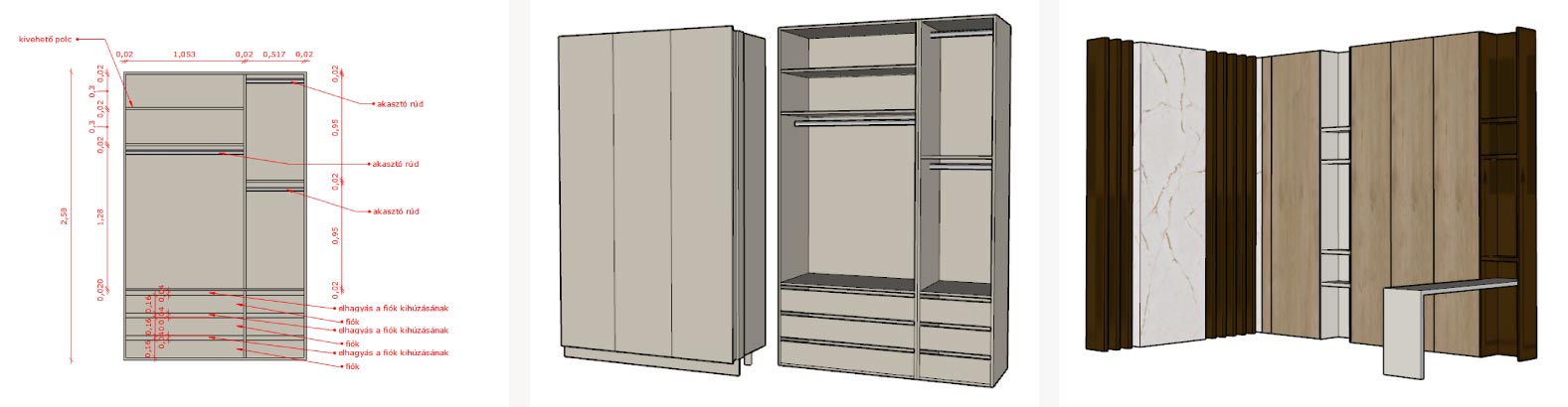 Ezekkel a tervekkel még a kivitelezés előtt láthatod, hogy milyen tömege lesz az enteriőrbe betervezett bútoroknak, lámpatesteknek, hogy 3d-ben hogyan épül fel a tér szerkezete, vagy éppen milyen hatása van egy egyedi bútornak a térben.
